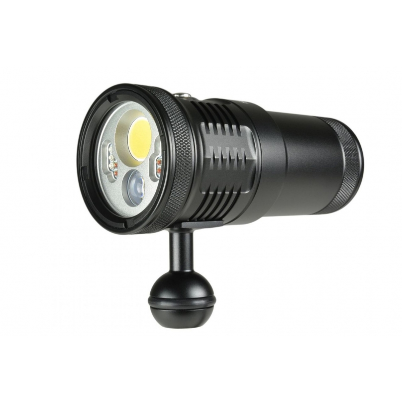 V14 – Latarka nurkowa foto/video z funkcją turbo światła video 4000lm. Wyposażona w 1 szt. diody emitującej światło 5000k, Ra 80 oraz 10 szt. diod emitujących światło czerwone, niebieskie, różowe oraz 1 szt. diody emitującą światło spot.